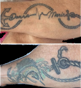 One man came in with an anchor and rope tattoo on his forearm. In the middle of the anchor was his ex-wife’s name — and they were only married for six months! He told us he got it one night after a few drinks, thinking it was a romantic gesture that would last forever. Unfortunately, “forever” ended much sooner than expected. After their divorce, he couldn’t stand to look at it anymore. Because the tattoo was dark and detailed, we worked carefully to remove just the name portion, and he later did a cover-up design that turned out beautifully.